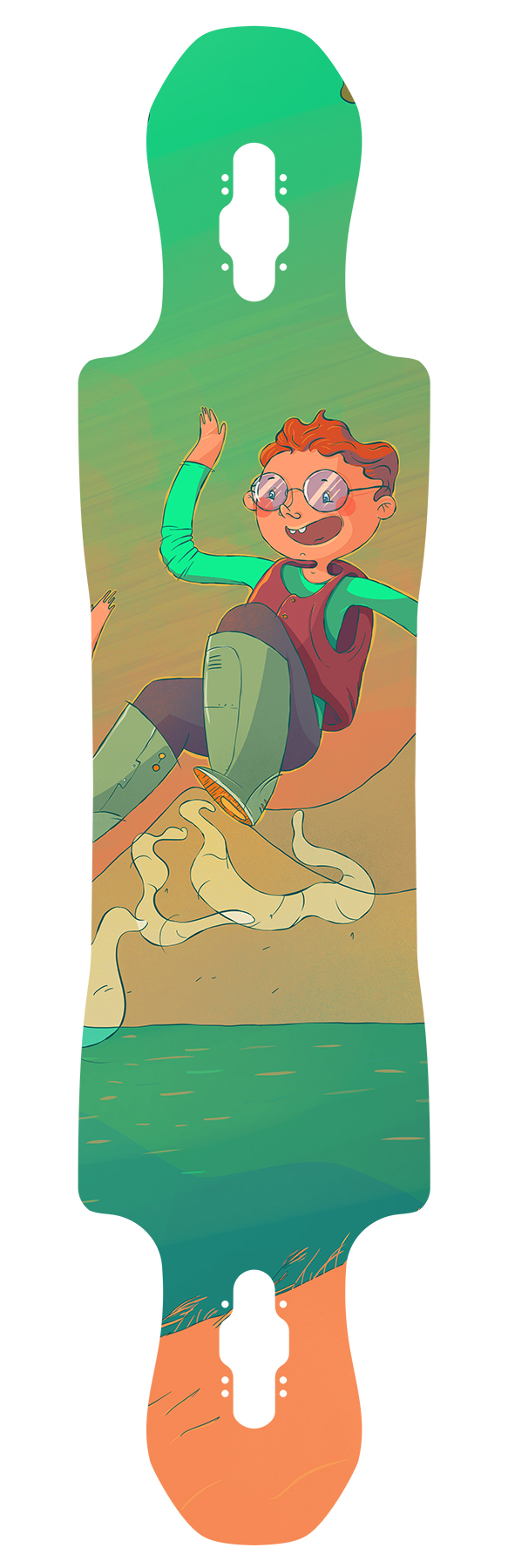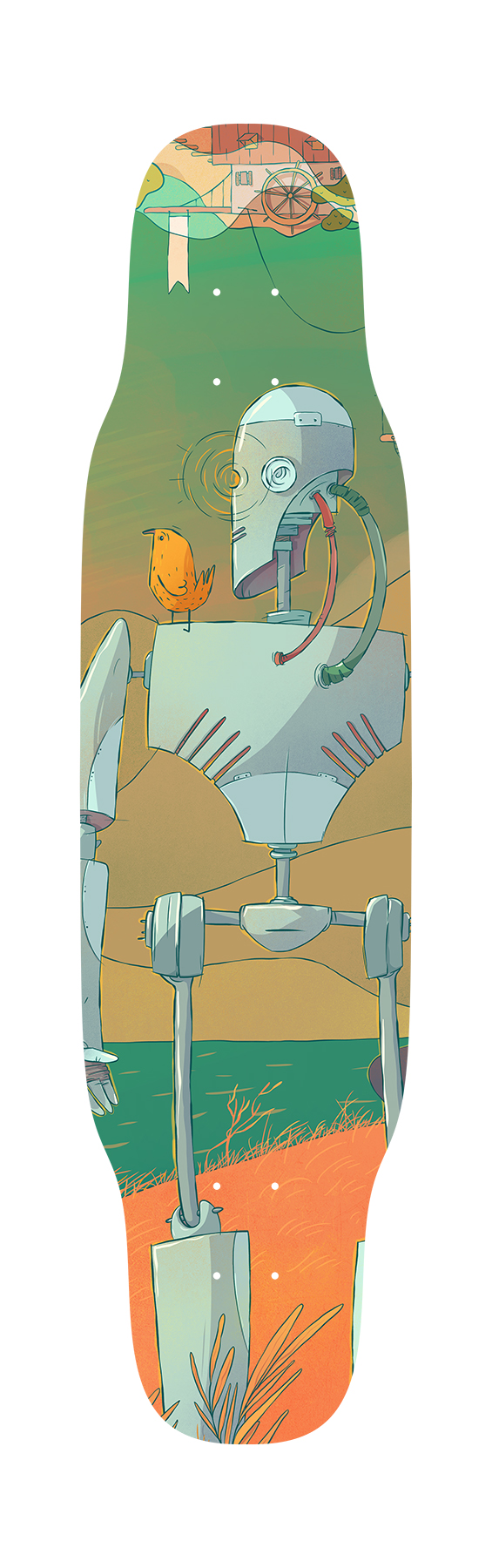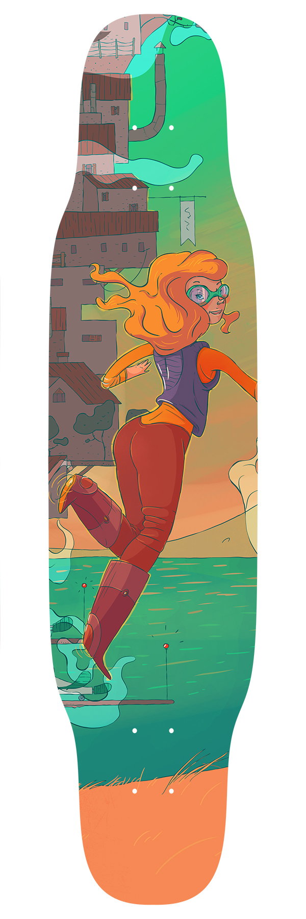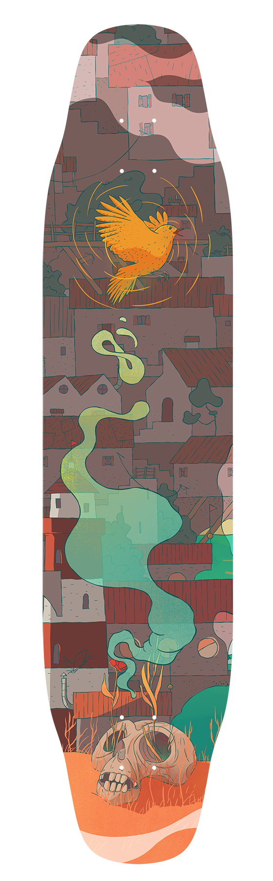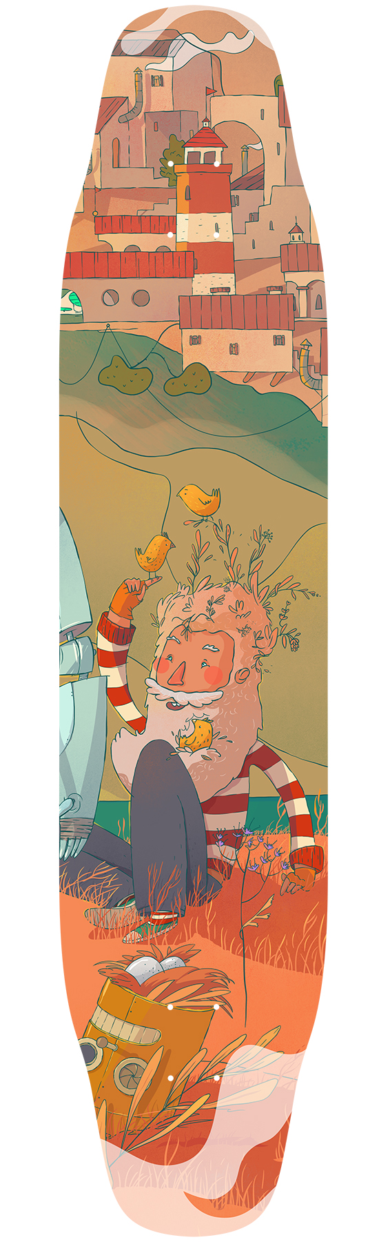 Создание иллюстрации для серии лонгбордов. Концепция заказчика состояла в создании некоего мира после апокалипсиса, обитатели которого переместились под землю. Этот мир солнечный и теплый, как в фентези-мультиках. Параллельно вторым художником прорабатывалась другая серия с обратной стороной этой концепции — мрачный разрушенный надземный мир